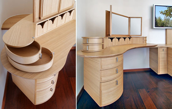 שידת איפור בציפי פורניר, עשויה מאלון אירופאי שטרייף, עם מגירות עגולות, העץ מכופף סביב שבלונה שיוצרה במיוחד עבור הרהיט.