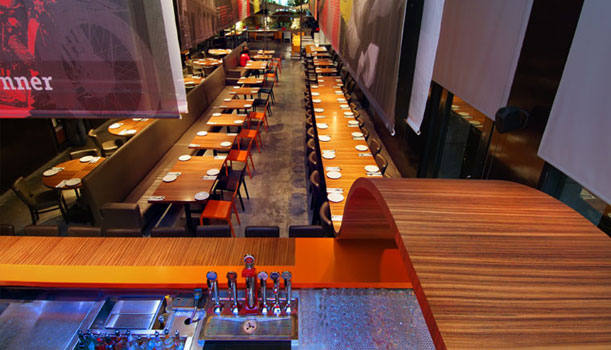 דלפק אכילה גלי המטפס בזרימה מהריצפה עד לקומה השניה. סנדוויץ ליבנה בגמר פורניר זברנו.מסעדת אודיאון, הרצליה.