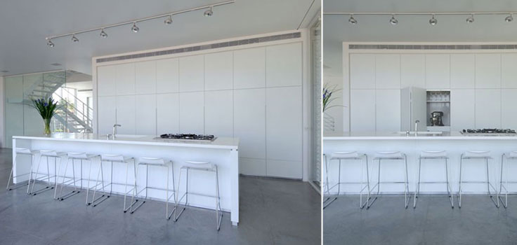 Everything is hidden behind the cabinets – the refrigerator, kitchen utensils etc. for a clean, aesthetic appearance. The functional island id designed for seating as well as kitchen tasks.